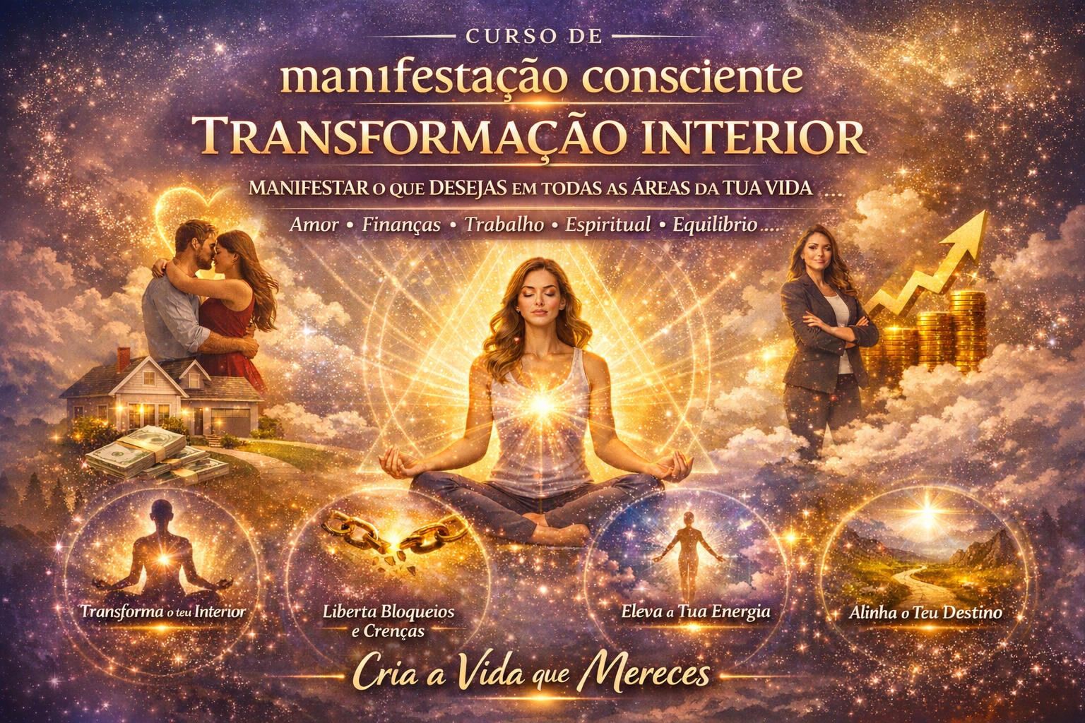 Não é motivação. Não é pensamento positivo. É reprogramação consciente + energética. O que é, na essência: É um curso onde aprendes a manifestar de dentro para fora, trabalhando: Energia – o que realmente estás a emitir Identidade – quem tu acreditas que és Subconsciente – padrões, crenças e bloqueios invisíveis Linhas temporais – passado, presente e futuro alinhados. Capacidade de receber (merecimento) Coerência entre intenção, emoção e ação.